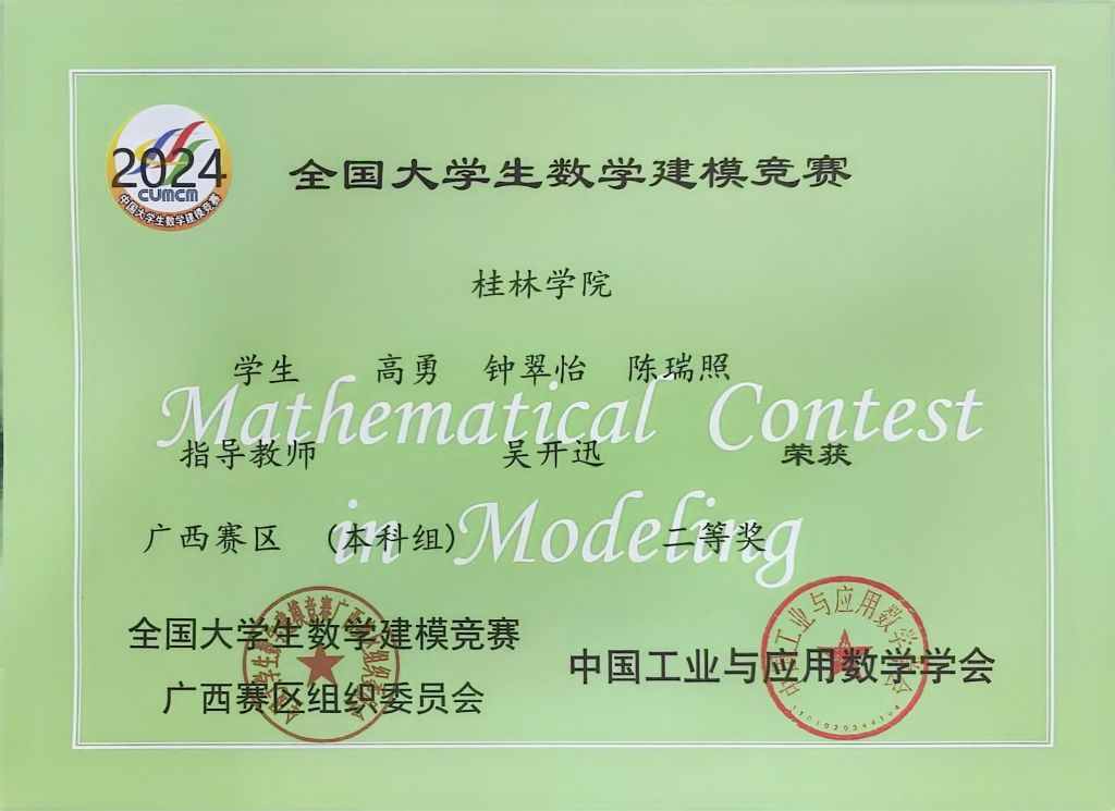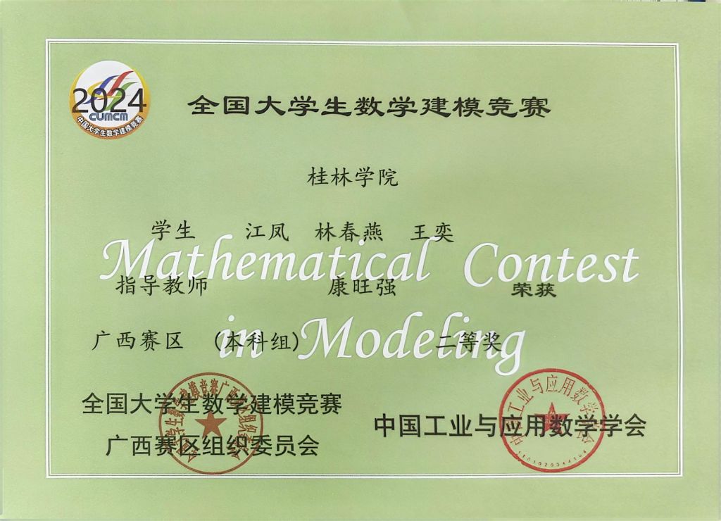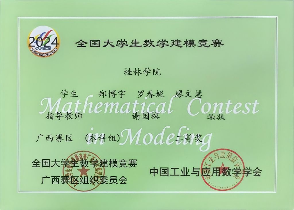 近日,2024 年全国大学生数学建模竞赛成绩正式揭晓。我校20支参赛队凭借实力和不懈努力,共荣获11项奖项,其中广西二等奖3项,广西三等奖8项,获奖率高达55%,在广西高校中获奖率排名第三。我校共有由60名学子组成的20支队伍参赛,他们分别来自数学与应用数学、数据科学与大数据技术、计算机科学与技术、电子信息工程、软件工程、金融学类、工商管理7个不同专业,汇集了全校所有的数学建模爱好者。