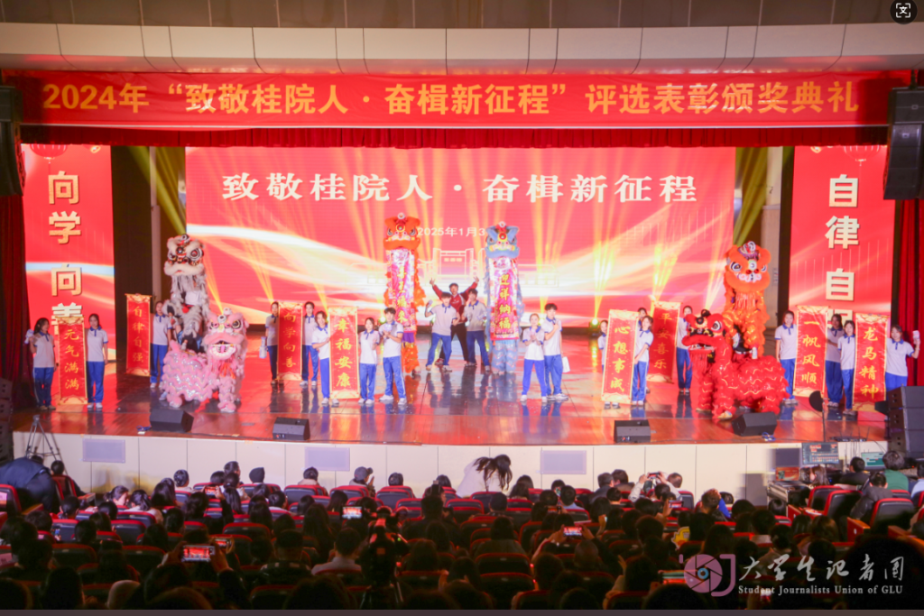 1月3日,学校2024年“致敬桂院人·奋楫新征程”评选表彰颁奖典礼在弘善讲堂举行,颁奖典礼表彰先进典型,向2024年取得的成就致敬,给奋斗的桂院人点赞,为做大做强桂林学院鼓舞士气、凝聚民心。学校董事长陶毅、校长吴郭泉、党委书记唐文红及全体校领导出席颁奖典礼,并为年度致敬人物、团队和成果颁奖。各二级学院、各单位师生代表共600余人参加了典礼。