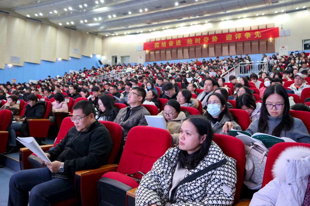 校长吴郭泉以《务实笃行正当时,迎评奋进再出发,为全面提高学校教育教学质量和整体办学水平而团结奋斗》为题,作了主旨报告。吴郭泉表示,过去五年,学校坚持立德树人根本任务、确保了社会主义办学方向,专业供给侧改革不断深化、专业融合发展格局初步建立,专业内涵建设不断加强、人才培养质量持续提高,校企合作产教融合持续推进、应用型人才培养能力不断提升,创新创业教育改革持续深化、创新型人才培养初见成效,教师队伍建设不断加强、师资队伍结构不断优化,教学基本条件建设不断加强、育人能力不断提升,学校教育事业取得了突出成就。吴郭泉指出,当前学校本科教育教学改革和人才培养面临着新形势、新机遇和新挑战,要高度重视新时代高等教育新发展、城市型大学发展新定位、教师队伍新标准对学校现有学科专业布局、应用型内涵建设、师资队伍整体能力提出的新要求。吴郭泉强调,学校要坚持“以评促建,以评促改,以评促管,评建结合,重在建设”方针,将迎评工作与日常教学深度结合,加快优化学科专业结构布局、全面推进学科专业内涵建设、持续加强优质课程建设、深入推进校企协同产教融合、持续提升教师教育教学能力、持续加强质量文化建设、促进学生多元发展,以迎评为契机,持续推进教学工作迈上新台阶。吴郭泉要求,全校上下要切实提高政治站位,深刻认识合格评估的重要意义;要加强政策学习,精准把握合格评估的内涵要义;要切实科学谋划规划,系统突破迎评工作的重点堵点,通过实施评估指标建设工程、质量工程、人才工程、特色工程、管理工程、平安校园工程等六大工程落实以评促建与高质量发展相结合;要切实强化责任担当,努力夺取合格评估的全面胜利;要坚持敢作善为,高标准完成本科教学工作合格评估任务。