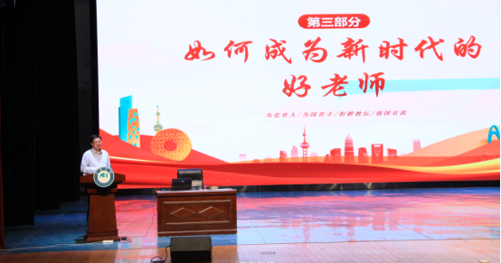 南宁师范大学二级教授、广西教学名师、自治区人民政府督学朱家安教授以«弘扬教育家精神建设教育强国»为题做首场报告,认真领学了«纲要»,强调课程思政融入各专业课程教学的重要性。