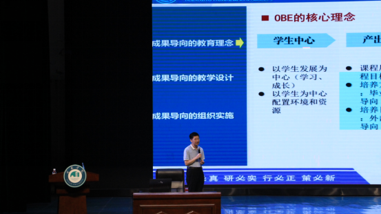 随后,南宁师范大学教育学部专职主任、广西壮族自治区人民政府督学、全国普通高校本科教育教学院校评估专家、广西壮族自治区模范教师,杨进红教授带来了“OBE教育理念下高校课程设计与实施策略”的专题讲座。他详细介绍了OBE教育理念的核心要点,并结合高校课程设计与实施的实际,分享了诸多实用的策略和方法。讲座内容具有很强的针对性和可操作性,为教师们在教学实践中运用OBE教育理念提供了清晰的思路。