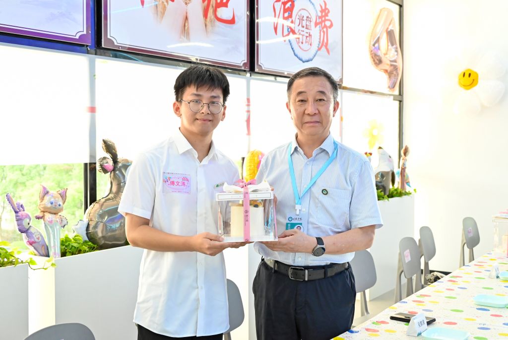吴郭泉向师生代表赠送生日蛋糕