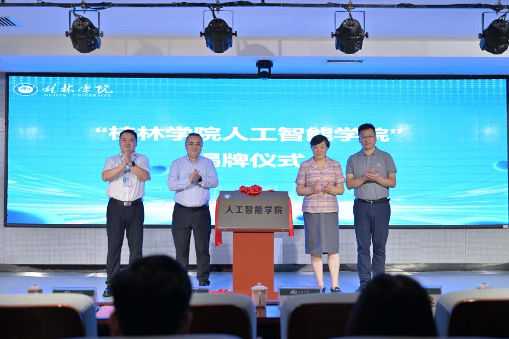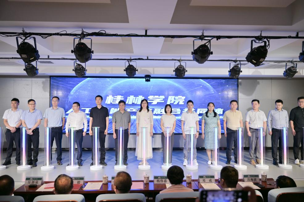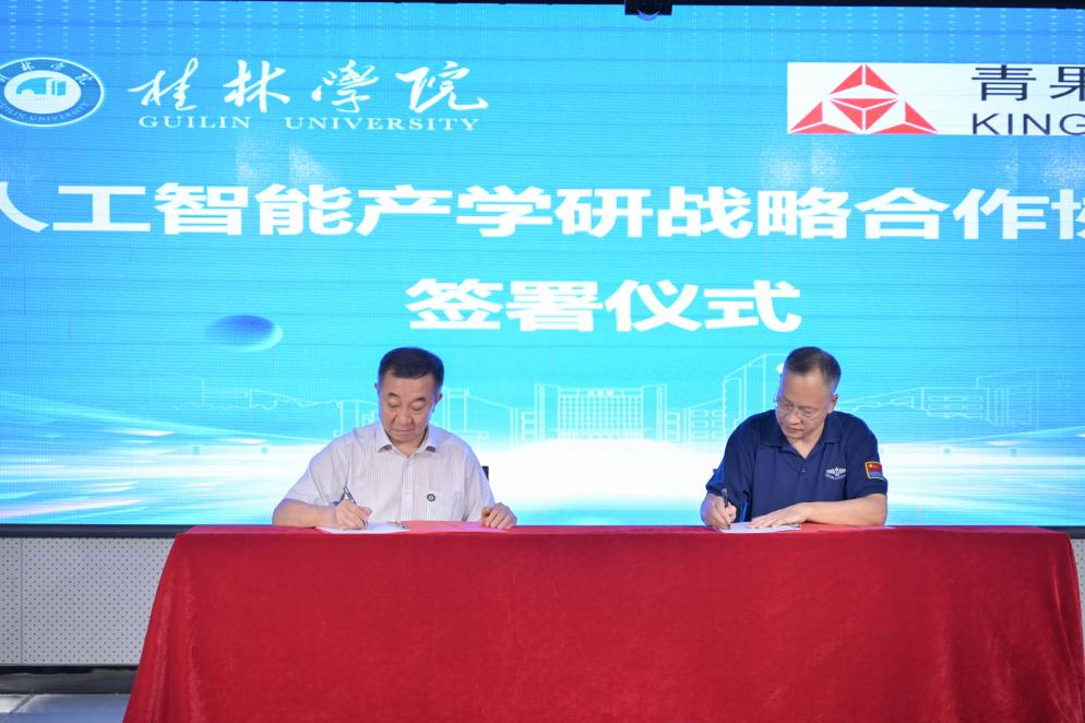随后,周彦、杨伟嘉、陶毅、邓成共同为“桂林学院人工智能学院”揭下红色帷幕;吴郭泉代表学校与企业方代表青果软件集团有限公司董事长张光铎共同签署《人工智能产学研战略合作协议》;同时,由学校牵头,联合区内高校、桂林市重点产业园区及十余家人工智能科技企业共同组建“桂林学院人工智能产教融合共同体”宣告成立。