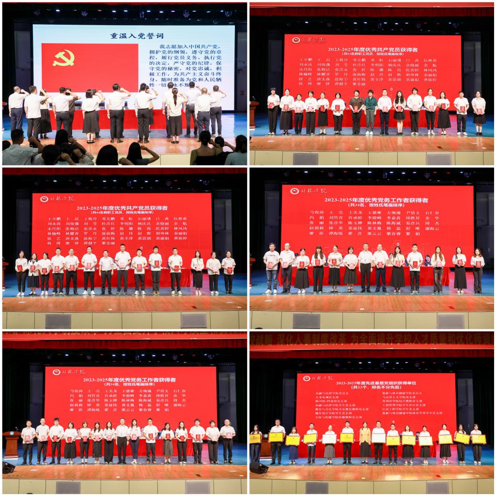大会隆重举行庆祝中国共产党成立104周年暨“两优一先”表彰活动。全体与会中共党员重温入党誓词。大会表彰了2023-2025年度优秀共产党员、优秀党务工作者和先进基层党组织。会上,党委组织部就在迎接本科教学工作合格评估中充分发挥党组织和党员作用发出倡议,号召各级党组织和党员锚定评建目标、攻坚重点任务、锤炼过硬作风,让党旗在评估一线高高飘扬。