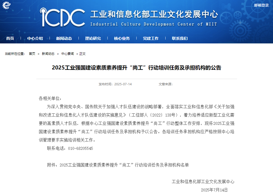 近日,工业和信息化部工业文化发展中心正式发布《2025工业强国建设素质素养提升“尚工”行动培训任务及承担机构的公告》,我校凭借突出的办学实力与培训经验,获准承担“生成式AI技术与场景应用”方向培训任务,由继续教育学院牵头组织实施。