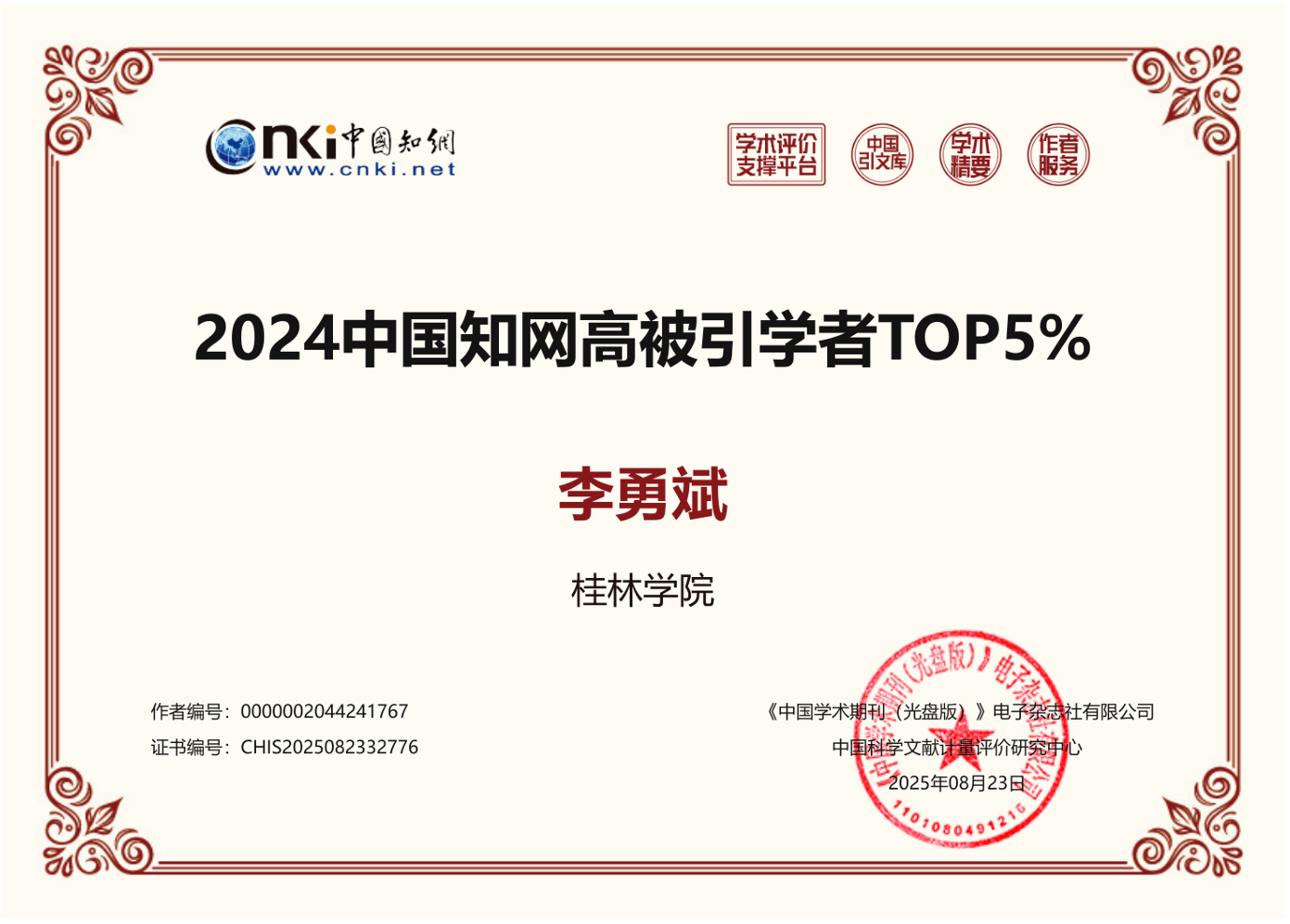 近日,中国知网下属中国科学文献计量评价研究中心(简称“知网评价中心”)依托中国知网收录的国内学术成果,开展学者学术影响力客观评价工作,学校金融与法律学院教师李勇斌成功入选“2024年度中国知网高被引学者Top5%”名单。