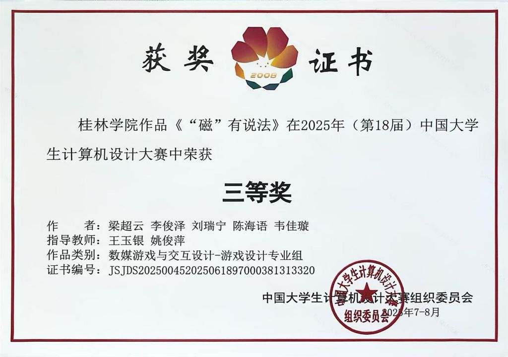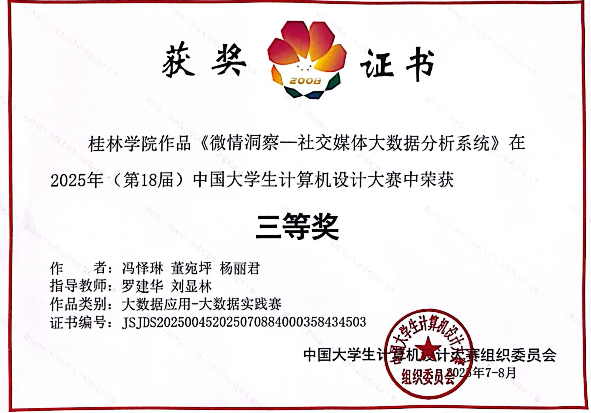 近日,2025年(第18届)中国大学生计算机设计大赛落下帷幕,我校参赛团队凭借扎实的专业功底与创新的设计理念,共获省级二等奖4项、三等奖9项,其中来自信息工程学院的《微情洞察- 社交媒体大数据分系统》《“磁” 有说法》两件作品还分获大数据实践、数媒游戏与交互设计赛道全国三等奖。