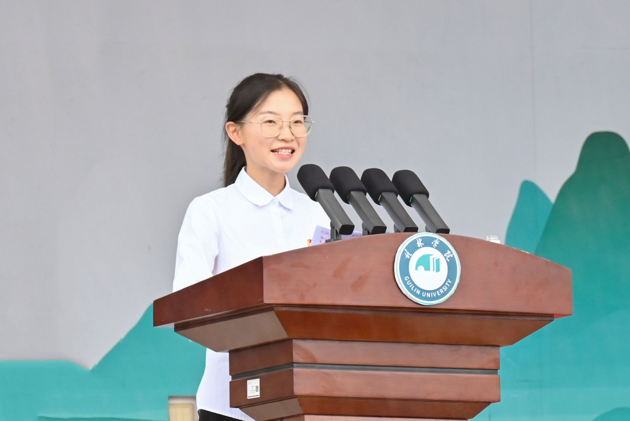 “桂院给我的记忆烙印,是刻在日常里的‘进步感’。”广西师范大学 2025 级学科(历史)专业研究生、桂林学院2021级播音与主持艺术专业毕业生陈宜作为校友代表发言,分享了自己考研深造的心路历程,他倡议学弟学妹们践行“向学、向善、自律、自强”校训精神,为铸造“走向成功的桥梁”和“造就人才的殿堂”贡献年轻桂院人的力量。
