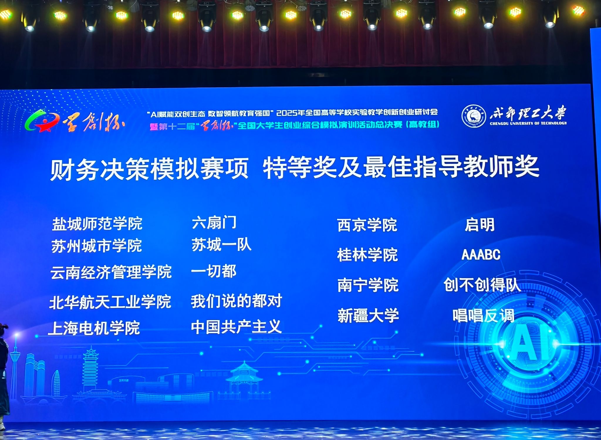 10月17日至19日,第十二届“学创杯”全国大学生创业综合模拟演训活动全国总决赛(高教组)在成都理工大学举行。经过校赛、省赛、全国半决赛及全国总决赛的层层选拔,我校参赛团队在本届比赛中实现历史性突破。其中,“AAABC”团队荣获财务决策模拟赛项全国总决赛特等奖,“卖保险”团队荣获该赛项二等奖。