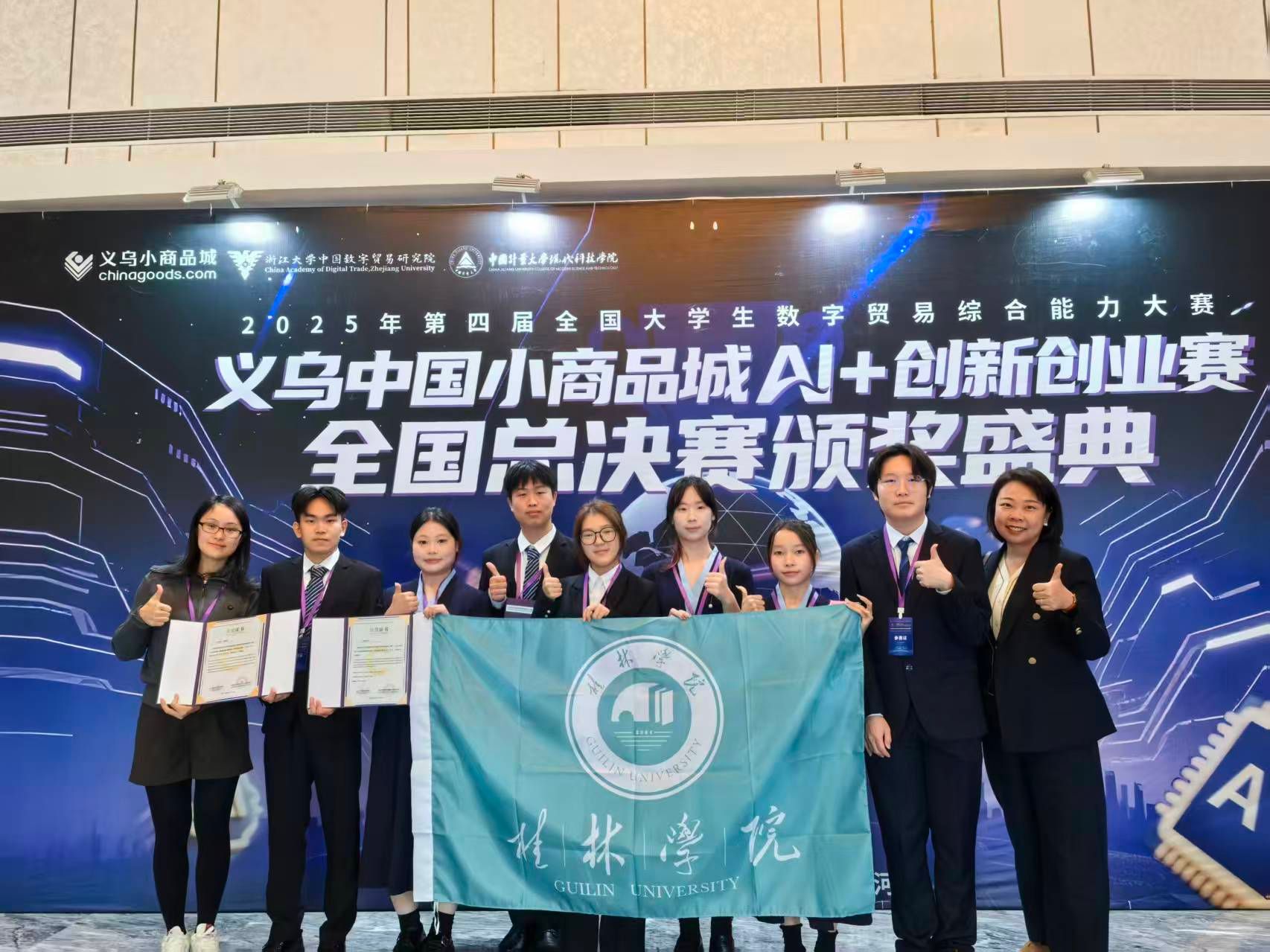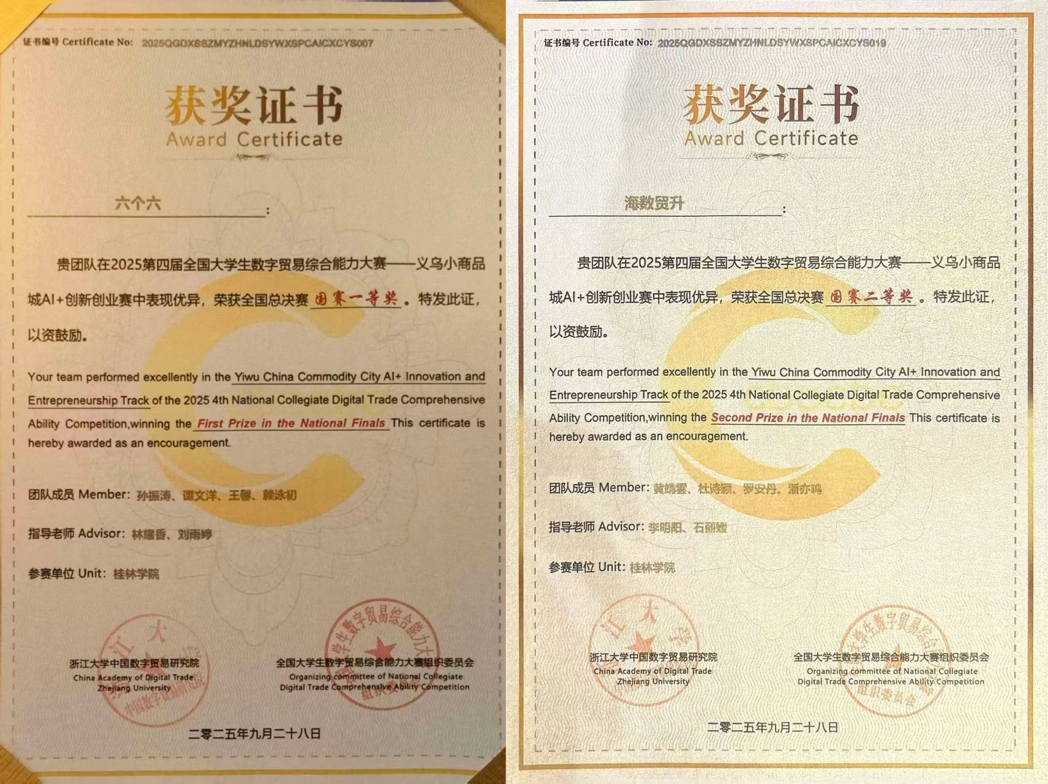 近日,2025年第四届全国大学生数字贸易综合能力大赛“义乌中国小商品城AI+创新创业赛”全国总决赛在浙江义乌圆满落幕。我校学子在激烈竞争中脱颖而出,派出的两支队伍从全国309所高校的2279支参赛团队中一路闯关,经过100多天的努力拼搏最终斩获全国一等奖1项、全国二等奖1项,其中国际经济与贸易专业团队摘得全国一等奖,电子商务专业团队荣获全国二等奖,充分彰显了学校在数字贸易领域人才培养的扎实实力。