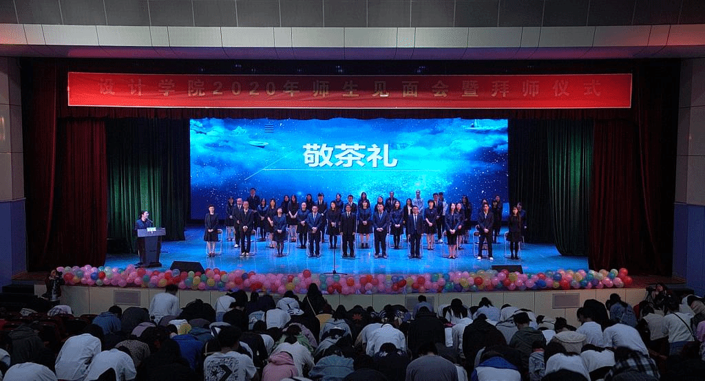 师生见面会开始,设计学院全体老师逐一亮相并依次为新生送上寄语。“今天的每一份努力都会换来未来丰厚的回馈”、“种一棵树最好的时间是十年前,其次是现在”……老师们的寄语或简短、或深情、或幽默,但每一句寄语都充满了老师对新生的关爱和嘱咐。拜师仪式环节,新生代表上台逐一向老师们敬茶,老师们向新生回赠了勤学礼。276名新生全体起立,集体向老师鞠躬并整齐说到“老师,您辛苦了”!