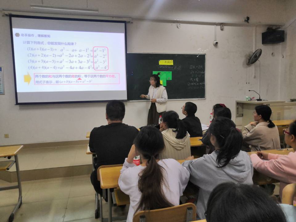 本次活动先由黄琼雯老师及2018级数学与应用数学专业学生包淑娟进行同课异构,课题来自湘教版七年级下册《平方差公式》。本次课为命题课,两位老师从平方差公式的引入、推导、验证和应用四个环节进行教学,授课过程完整、课堂气氛活跃,课件制作精美。在评课环节,刘翔以主任分别对两位老师在教学过程中出现的问题进行了评价,并给出了解决方案。接着他为同学们作了“中学数学教材解读”专题讲座,从四个“理解”出发引导同学们思考如何分析教材、处理教材,并指出《平方差公式》的教学难点是用面积恒等法证明公式,要尝试对图形的面积进行多种方式的恒等变形,从而突破难点。最后,刘老师总结了不同课型的授课模式,以及如何针对不同课型实施教学方法。