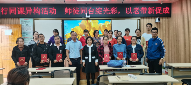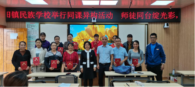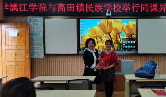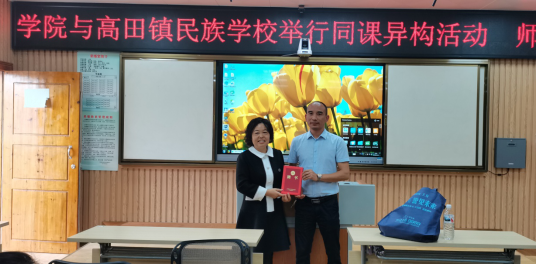 为了推进校地合作积极长远的发展,语言文学学院院长何玲教授、潘冠海教授为高田镇民族学校配合此次师范生教育的众位老师们现场颁发聘书并合影留念。