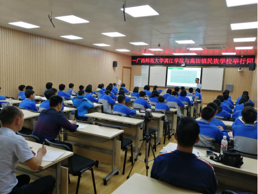 接着,高田镇民族学校教科副主任、广西壮族自治区特级教师覃晓芸组织大家进行评课,先是语文教研组长廖小筠老师进行点评,然后是周晓斌、刘心如两位老师分别讲述了自己的上课意图,接着是覃晓芸老师作小结。之后是语言文学学院的何玲教授、潘冠海教授进行精彩点评,最后是高田镇民族学校校长覃卫忠作总结性发言。