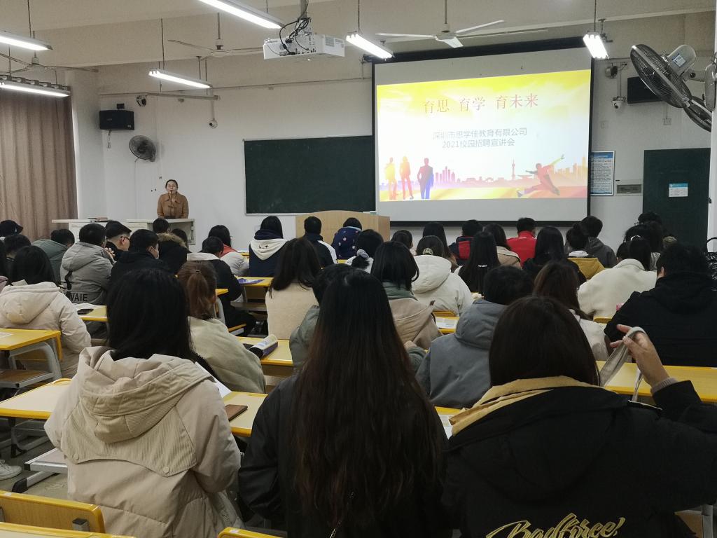 为了更好地拓宽毕业生的就业渠道,12月5日下午,理工学院邀请深圳市思学佳教育有限公司(以下简称“思学佳”)在至善楼1217教室举办2021届毕业生校园招聘宣讲会,本次宣讲会的主讲是思学佳人力资源部的石芹老师,参加宣讲会的有理工学院党总支副书记金云亮、毕业班辅导员莫玉芳、2021届数学与应用数学专业在校学生共六十余人。