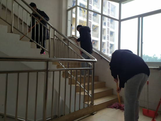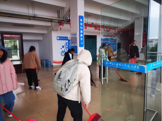 图:体育与健康学院学生打扫广西师范大学雁山校区五期宿舍楼