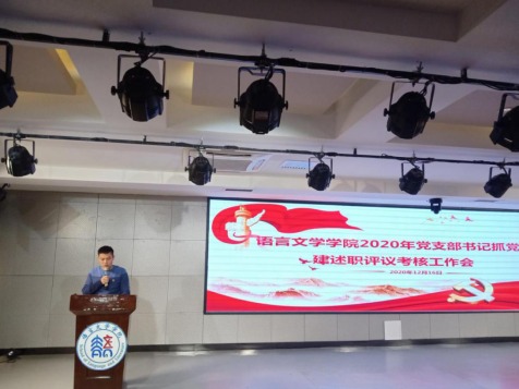 会上各党支部书记按抽签顺序依次上台就支部政治建设、思想建设、组织建设、作风建设、纪律建设等方面进行现场述职和展示,评议人员对述职人员现场进行评议打分。随后语言文学学院党总支书记江仿对2020年度学院党建工作进行全面、系统地汇报,并要求各党支部要强化结果运用,在今后的工作中继续找差距、抓落实,不断进行自我革新,不断推进语言文学学院党建工作纵深发展,继续发挥党支部战斗堡垒作用,为学院及学校建设贡献力量。