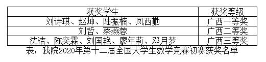 近日,2020年第十二届全国大学生数学竞赛初赛获奖名单已陆续公布,理工学院荣获广西一等奖四项,广西二等奖两项,广西三等奖五项,获奖率高达35.5%。此次竞赛既体现了我院高度重视实践教学,也体现了理工学院学子扎实的数学基础知识能力及专业综合能力。