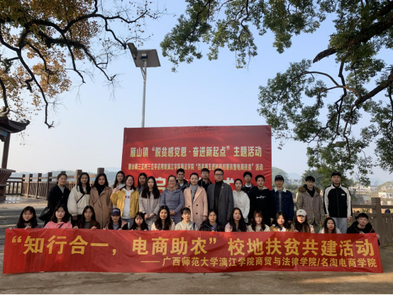 12月25日上午,商贸与法律学院/名淘电商学院党总支书记陈俊杰、电商教研室主任申茜、电商专任教师周莹及我院电商、国贸专业优秀学生、党员代表到雁山镇三立村参与“脱贫感党恩,奋进新起点”系列活动,及商法学院“百名师生进村结对帮扶暨电商扶贫”活动启动仪式,旨在进一步推进雁山镇农村电商发展的同时,增强本院学生的电商实战操作技能及经验,共同助力脱贫攻坚。