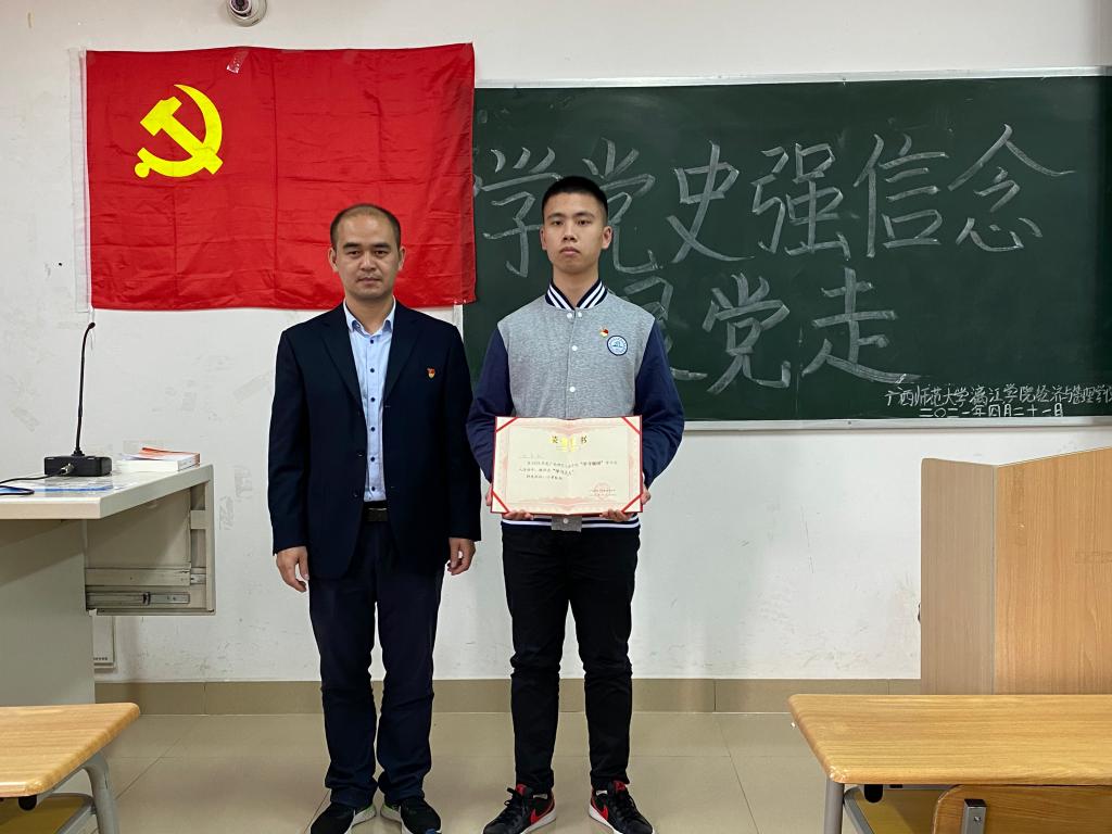 党课最后,甘华成还向学生党员何崇权颁发了“学习强国积极分子”的奖状。