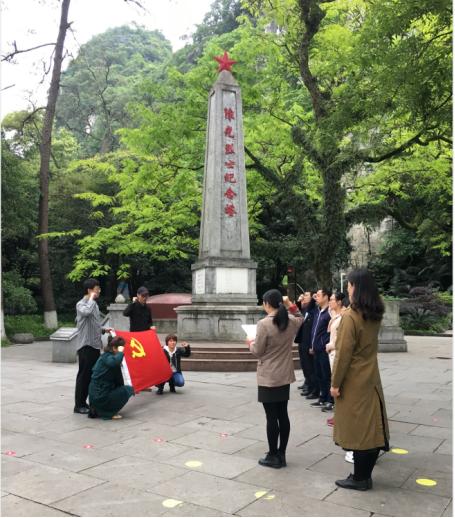 图:支部成员在七星公园陈光烈士纪念塔前瞻仰、重温入党誓词