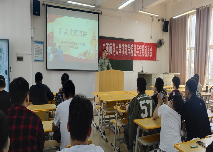 为进一步贯彻落实国家征兵政策,扎实推进我校大学生应征入伍工作,鼓励和引导大学生应征入伍,教育与音乐学院于4月29日上午在1507教室举办“广西师范大学漓江学院征兵宣传动员会”,会议特意邀请桂林市雁山区人民武装部苏瑜政委作为主讲人,为2021届毕业生做相关政策解读。