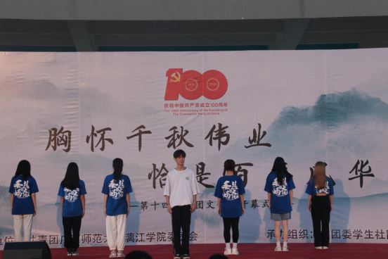 5月14日晚,为庆祝中国共产党成立一百周年,弘扬红色经典文化,发扬社团特色,校团委学生社团部在田径场举行以"胸怀千秋伟业,恰是百年风华”为主题的第十四届社团文化月开幕式。出席本次活动的嘉宾有校团委副书记蓝婷婷老师,校团委兼职副书记蒋承良老师,校团委干事黄莉丹老师,设计学院团总支书记、手工DIY环保协会、摄影协会指导老师麻学艳老师以及各学生社团指导老师、桂林市各大高校校团委学生社团部代表和学校各级学生组织代表。