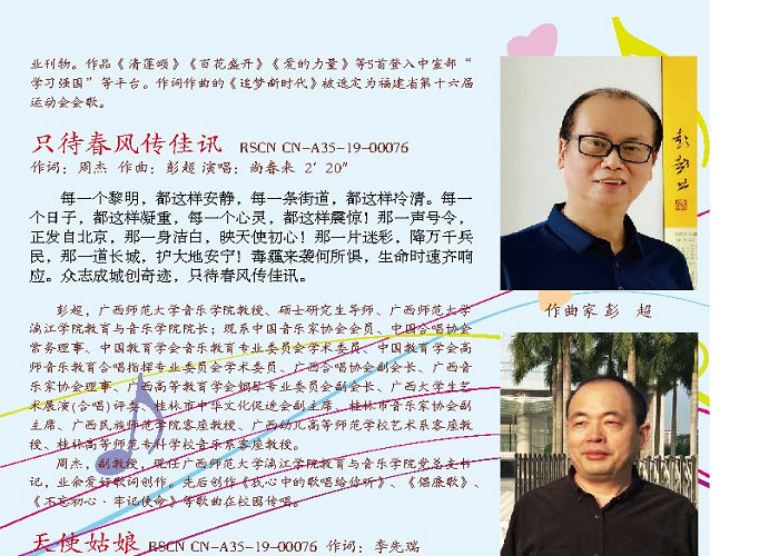 近日,由教育与音乐学院周杰作词,彭超作曲的抗疫题材歌曲《只待春风传佳讯》获公开发表,被收入《中国当代音乐家抗疫优秀歌曲CD选集》,该歌曲集由中国数字文化集团有限公司出版发行。这是教育与音乐学院有声原创作品第一次获得公开发表,既是学院老师关注社会的家国情怀的体现,也是音乐学专业的建设成果。