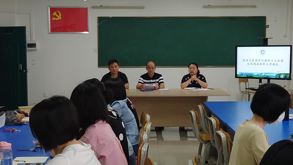 5月26日下午,经济与管理学院在3307教室召开教职工大会。学院领导班子成员出席会议,党总支书记甘华成主持会议,经济与管理学院全体教师参加本次会议。