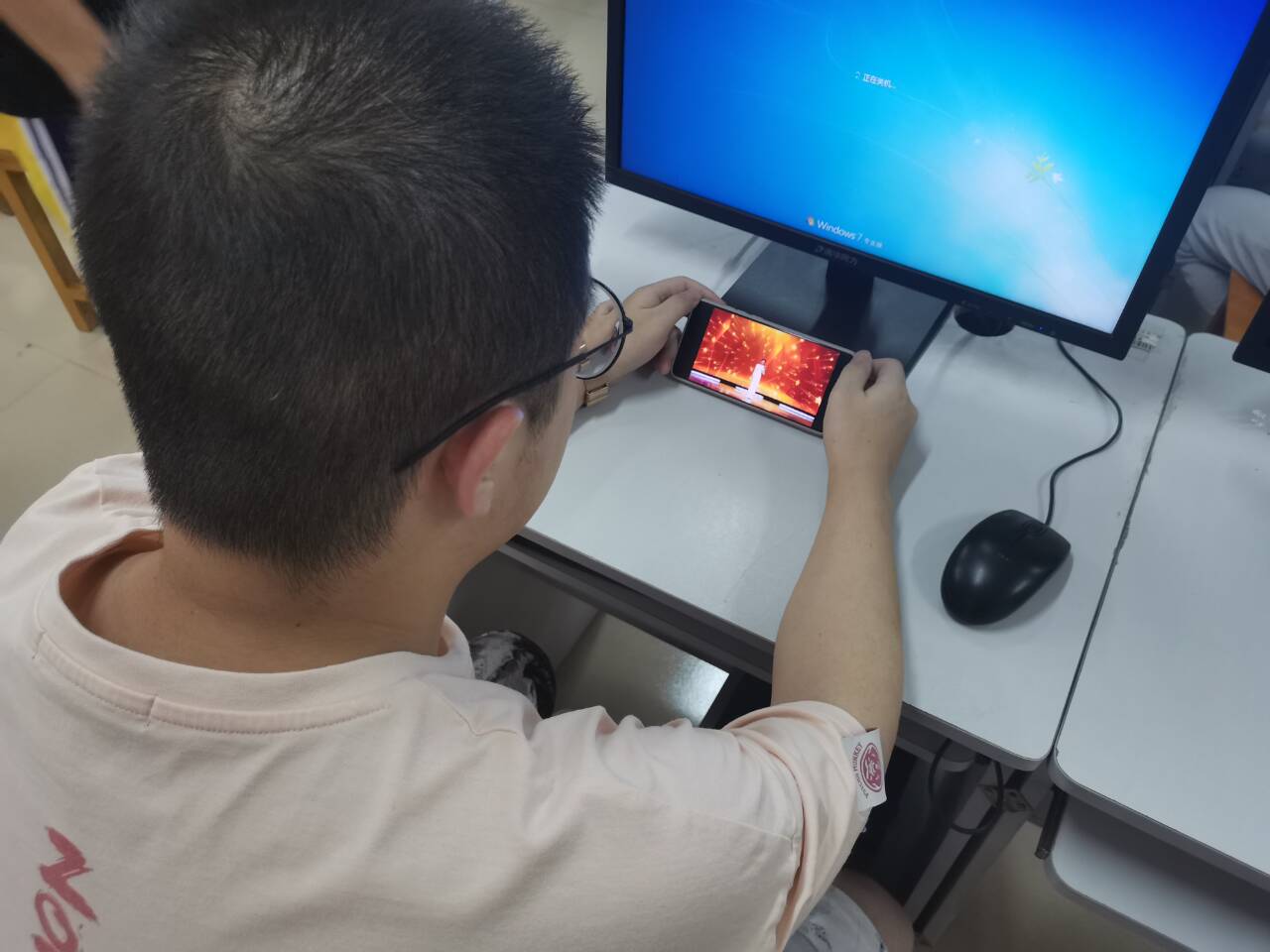 图:支部成员正在党员活动室集中观看视频