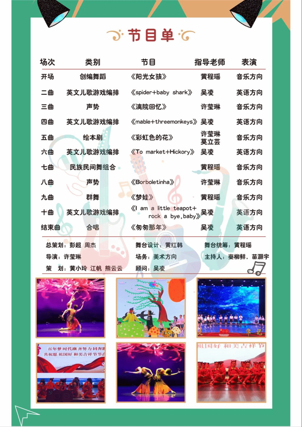 本场专业汇报演出一共有12个节目,其中英语方向主要展现的是英语儿童游戏活动,音乐方向展现的是声势、绘本剧、舞蹈与合唱,美术方向展现的是舞台道具制作与舞台设计。