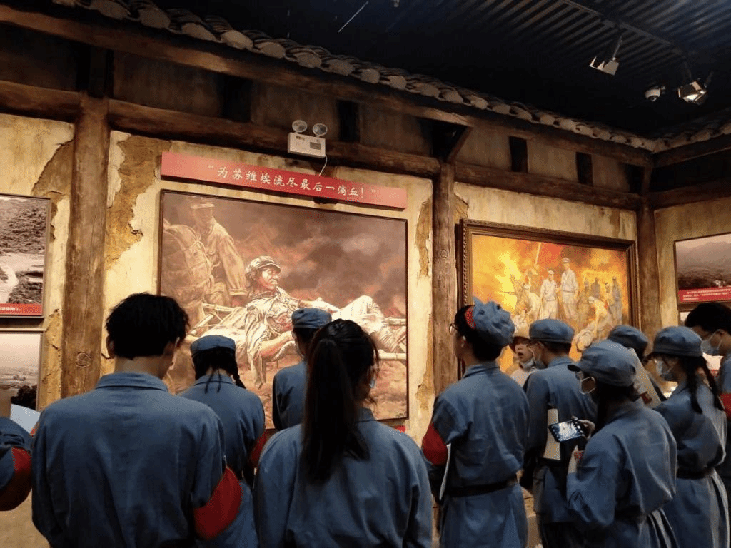 离开凭吊广场,团队成员进入了红军长征湘江战役纪念馆进行参观见学。一幅幅红军湘江战役作战图、路线图讲述着当时红军的艰难摸索、严峻形势,一把把锈迹斑斑的砍刀、长枪记录着红军当时的浴血奋战、不畏牺牲。最是打动团队成员内心的,是一幅陈树湘师长断肠明志的油画,讲解员说道:“陈树湘师长被俘虏的路上用手绞断了自己的肠子,牺牲后还被敌人砍下头颅挂在城门三天三夜,而眼睛所朝,却是有年迈的母亲、盼夫早归的妻子的他的家”,早有团队成员流下泪水,“为苏维埃流尽最后一滴血”的陈树湘师长的伟大精神从此刻在了团队成员心中。