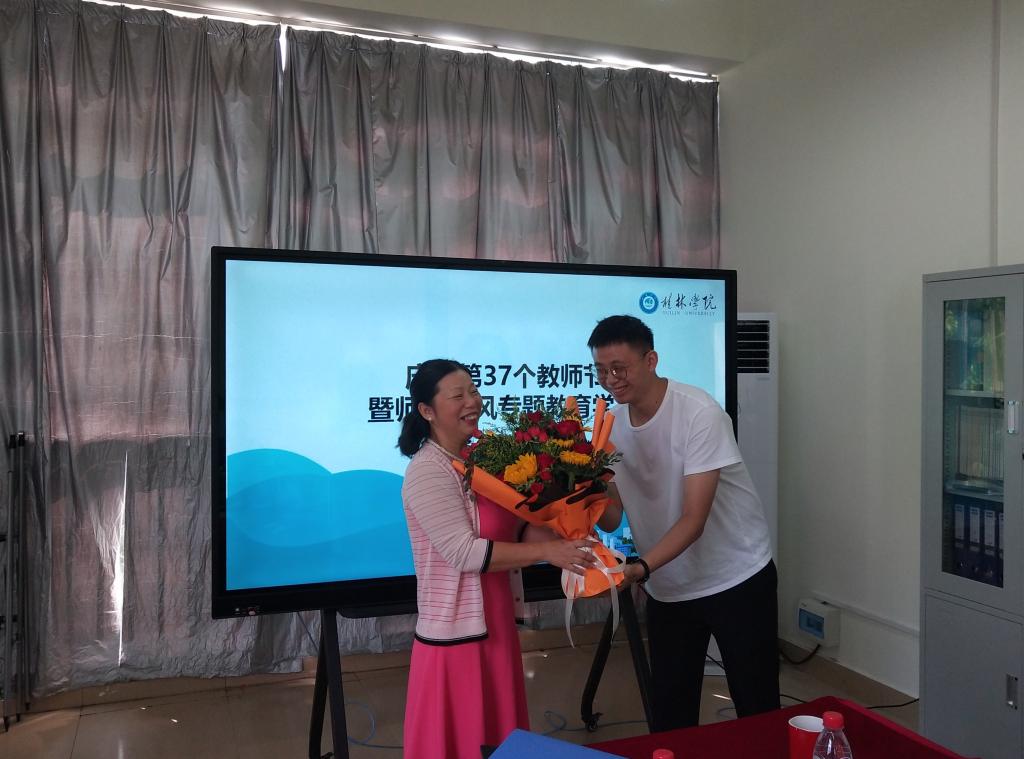 在活动开始,张常永院长向全体教师表示节日的问候和祝福,并由青年教师李延和刘莹分别向老教师代表曾云莺副教授、李会平副教授送上节日祝福。随后,副院长、党支部书记吴秋燕以“赓续百年初心,担当育人使命”为主题带领全体教职工回顾了党的十八大以来习近平总书记关于教育工作的重要论述,鼓励全院教师以习近平新时代中国特色社会主义思想为指引,砥砺前行,再接再厉,以先进典型为榜样,要进一步加强教师队伍建设,自觉在为党育人、为国育才新征程中实现新作为、再创新辉煌。