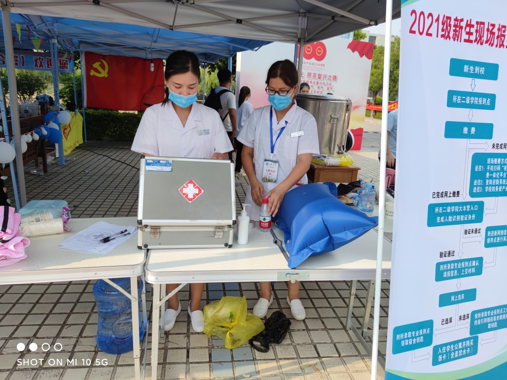医务室在校门口报到现场设置了临时医疗点,并为新生特别准备了一次性口罩、应急药品等物资以备不时之需。