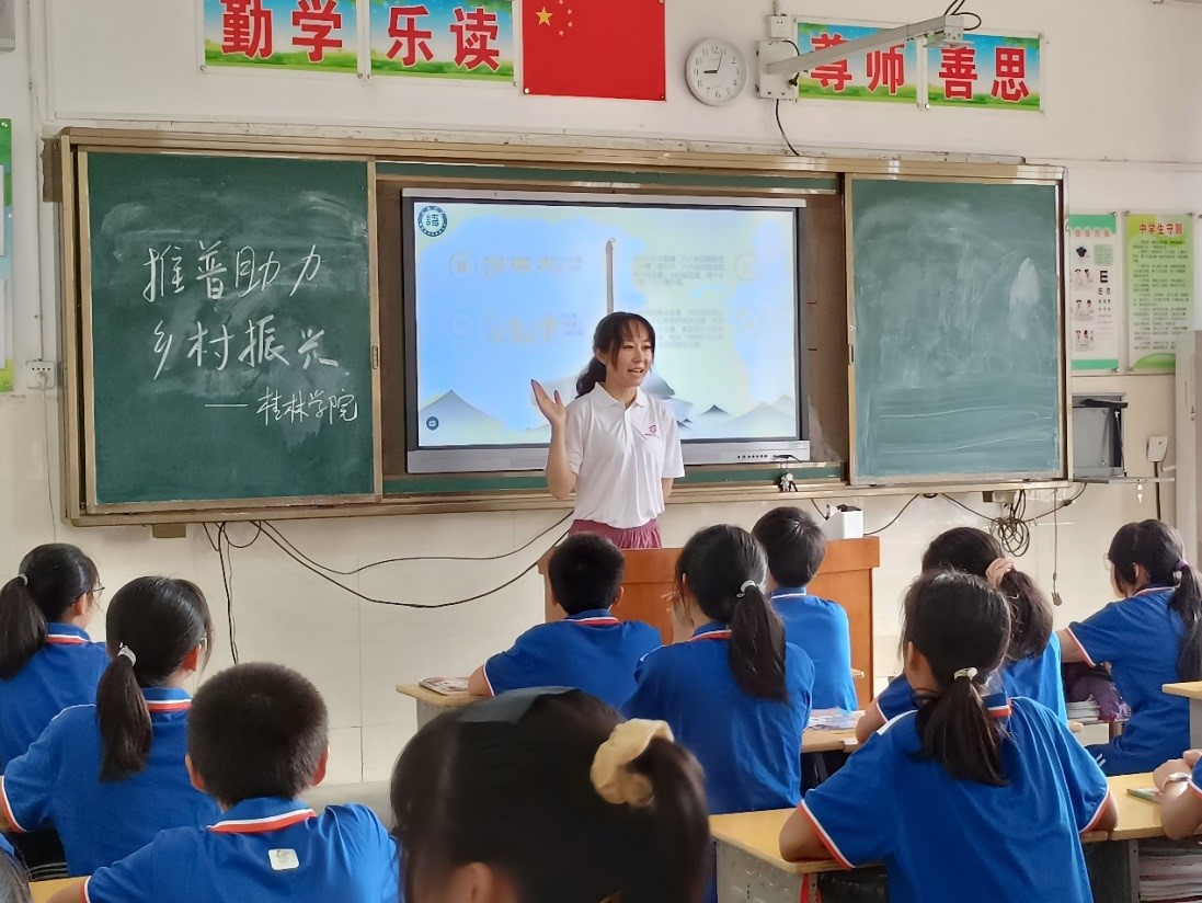 为庆祝中国共产党成立100周年,抓住青少年时期的语言学习关键期,着力加强青少年普通话教育,提高青少年的普通话水平和语言文化艺术的素养,帮助青少年成长成才。时值第24届全国推广普通话宣传周,9月16日上午,学校语言文字工作委员会前往阳朔县葡萄镇初级中学开展“推普助力乡村振兴”暑期社会实践志愿服务活动。语言文学学院副院长、校语委常务副主任陈锴老师,校语委指导老师邓克鹏、何一亿以及校语委学生干部参加本次活动。