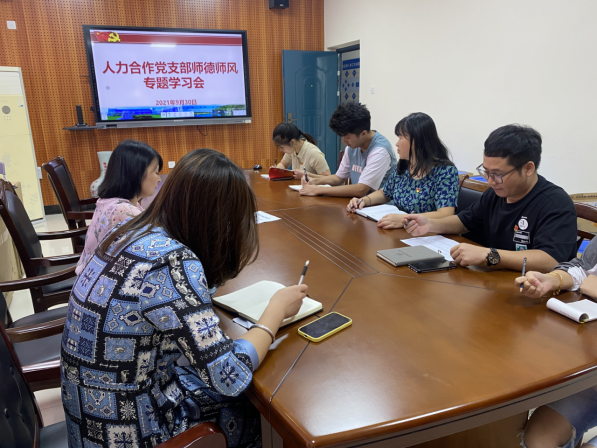 为增强支部教职工政治认同、思想认同、情况认同,结合学校师德师风建设主题活动日的要求,9月30日上午,人力合作党支部在知善楼8207会议室召开师德师风建设专题学习会。