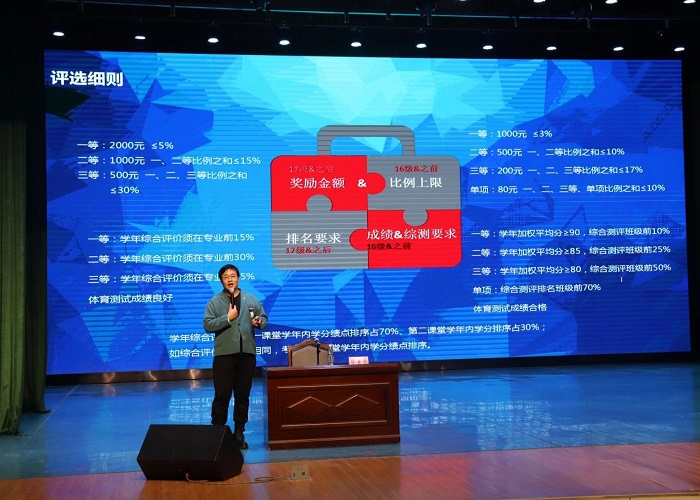 陈意扬老师首先对学校整体的学生资助工作概况作了简要介绍,然后分别就奖助学金评审、勤工助学、助学贷款、征兵学费补偿等资助项目的申请对象、申请条件、申请流程等进行了详细讲解,同时,对学校开展的感恩教育、诚信教育等资助育人活动也作了具体说明。鼓励同学们要自觉树立诚信、自强、感恩、成才意识。