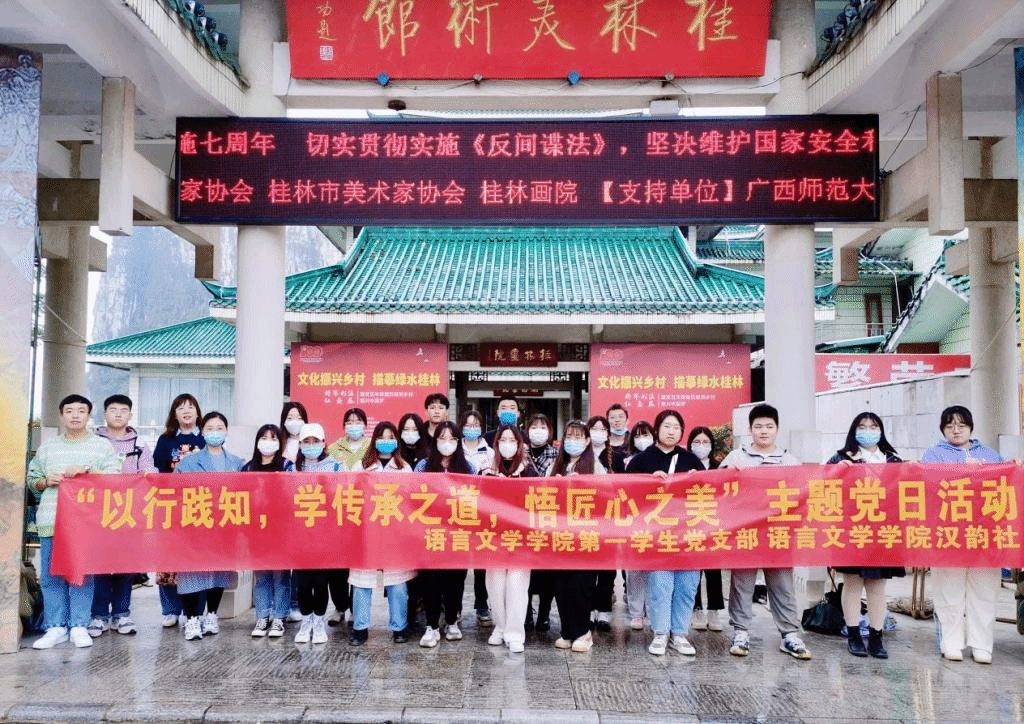 语言文学学院第一学生党支部于11月3日下午组织师生党员及拟发展预备党员、汉韵社社员赴桂林美术馆开展以“以行践知,学传承之道,悟匠心之美”为主题的党日活动。旨在推动学生专业特色与中华优秀传统文化相融,时代精神与中华优秀传统文化相通,坚定新时代文化自觉和文化自信。