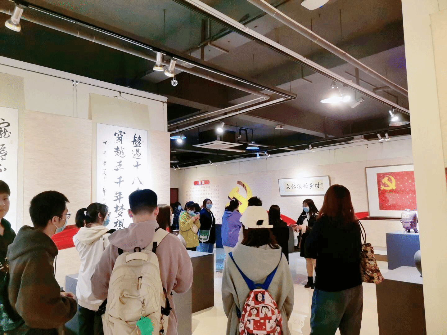 观展时,学生党员们交流探讨、拍照记录,感受艺术的同时以匠心精神砥砺初心使命、传承中国风范。
