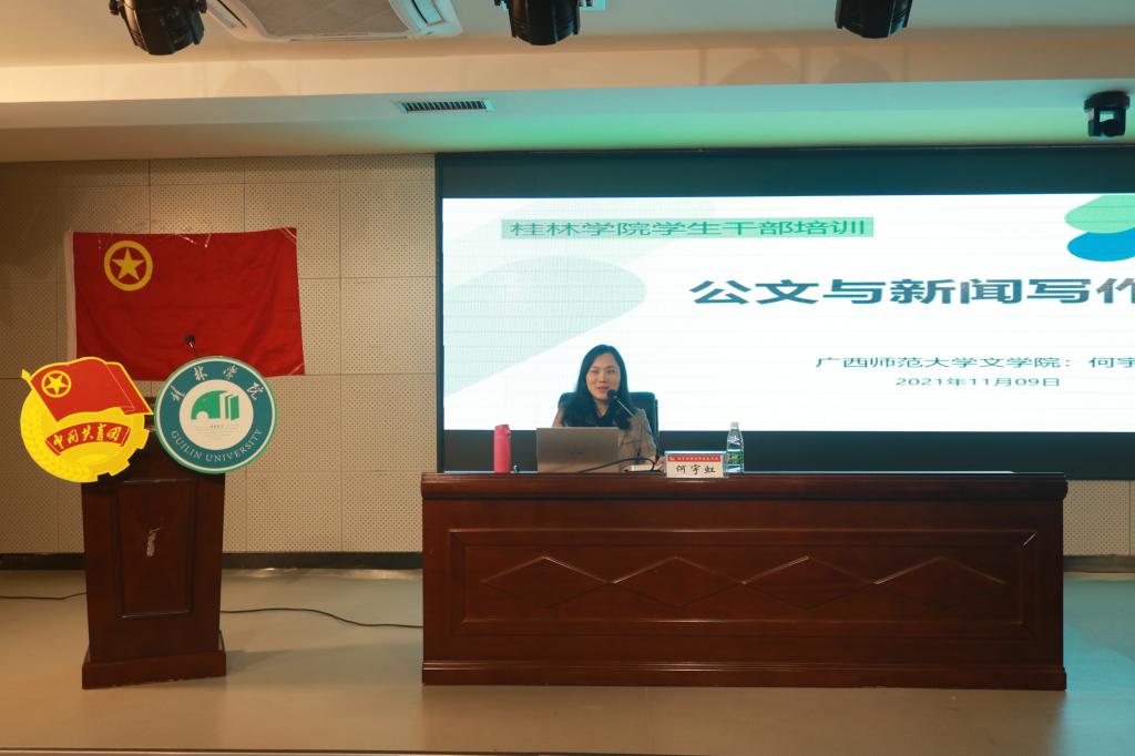 11月9日晚,为进一步增强我校基层团学骨干的凝聚力和创新力,全面提升基层团学骨干队伍的理论水平和日常办公效率,校团委在至善讲堂组织开展2021年秋季学期“青雁领航计划”基层团学骨干培训班开班仪式暨专题讲座。开班第一课邀请到广西师范大学文学院何宇虹博士为同学们带来主题为《公文与新闻写作培训》的专题讲座。校团委老师及各团属学生组织代表参加本次活动,活动由学生事务部副部长/校团委书记王瑞主持。
