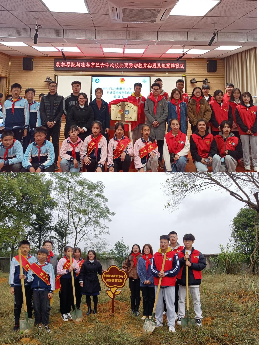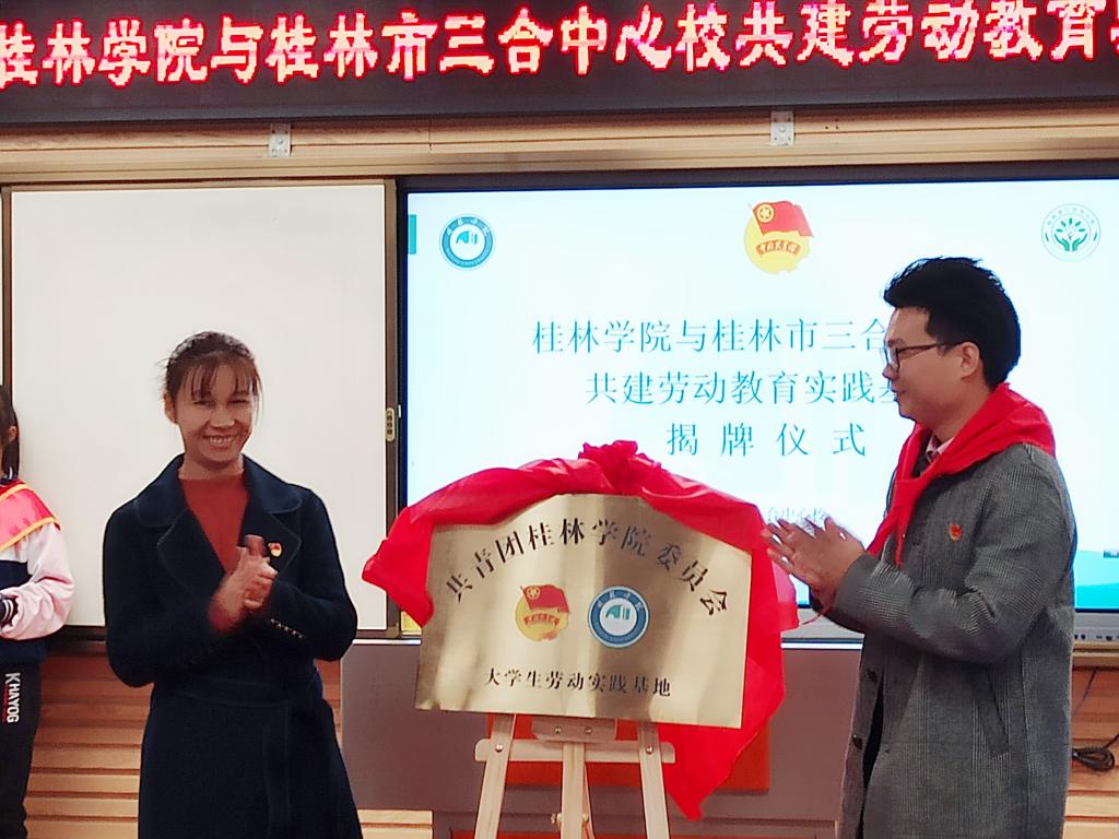 11月15日上午,为贯彻落实中共中央国务院《关于全面加强新时代大中小学劳动教育的意见》的文件精神,进一步落实立德树人根本任务,构建德智体美劳人才培养的“五育融合”教育体系,培养德智体美劳全面发展、基础扎实、知识宽厚、具有“至善”品格的应用型、技术技能型人才。我校与桂林市三合中心校在该校录播室举行共建劳动教育实践基地揭牌仪式。桂林市三合中心校校长莫运珍、党支部书记黄辉、教导处副主任阳智,我校学生事务部副部长/校团委书记王瑞、校团委老师及两校学生代表参加本次活动。揭牌仪式由我校团委相关负责人主持。