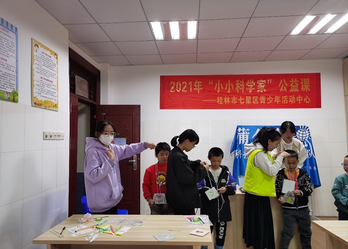 桂林的初冬,凉风习习。11月7日下午,教育与音乐学院九色禾光公益科普支教团在指导老师余华、范霞的带领下,来到七星区青少年活动中心,开展“学史力行·劳动筑梦——小小科学家”公益科普支教活动。本次支教活动开设了《上爬蜘蛛》的科普实验课程,目的是为让孩子们打开思维的天空,发现生活中的科学妙趣,培养他们对科学的兴趣,有利小朋友的全面发展。