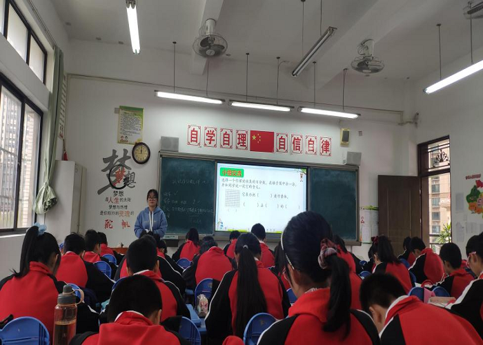 图:实习生米羡在银杉路小学上公开课《认识百分数》