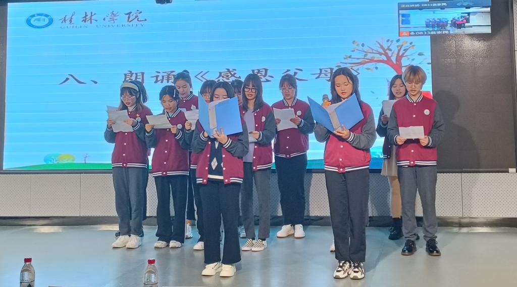 会议第四项,由2019级商务英语和越南语泰语专业的同学朗诵《感恩父母》。她们为线上家长带来了惊喜,把许多曾经想对父母说却未说出口的话包含在了充满感情的字句里,用充满真情的朗诵表达出了对父母深深的爱。辅导员银英还组织家长们在家长群里进行交流,辅导员和各专业老师将第一时间进行解答。