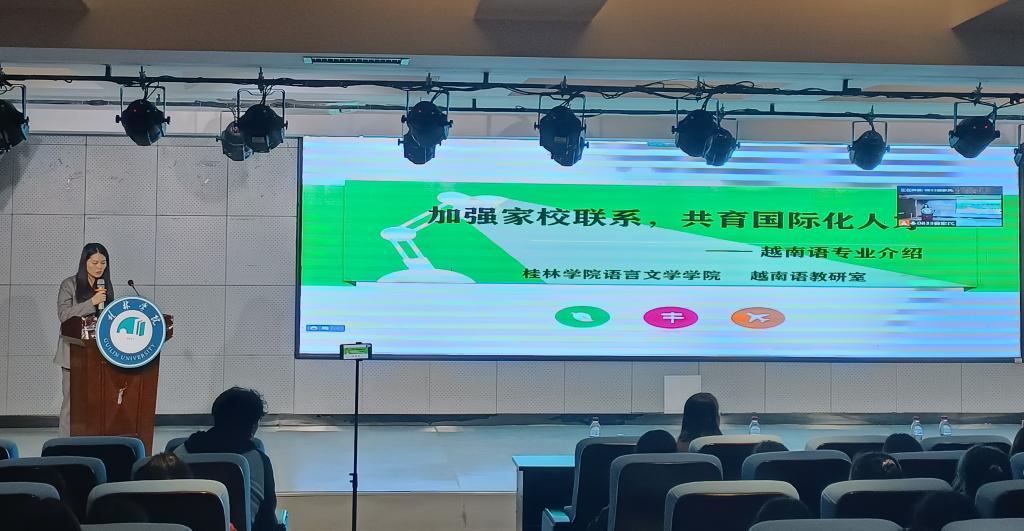 会议第二项,由辅导员和各教研室主任分别报告学生教育教学情况。辅导员银英从学生基本情况、学分清查及学生获奖、学校管理制度、难点和期望四大方面入手,着重列出入党积极分子和获奖同学,希望同学们以此为榜样。同时也强调了学生心理健康、电信诈骗等问题,希望和家长们保持密切联系,加强家校互通,了解学生真实想法,携手共育,从而提高教育效果。2019级商务英语专业教研室主任周燕萍老师、越南语专业教研室主任阳琦兰老师、泰语专业教研室主任姚垚老师依次向学生及家长介绍了本专业的人才培养模式、学生实习及就业情况、过去一段时间的获奖情况等,用自己的实力成果直观地展现了师生风采,极大地增强了学生和家长的信心。