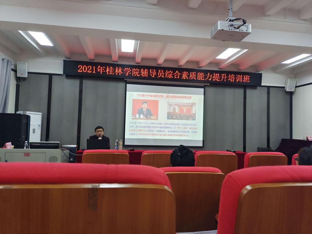 为深入学习贯彻党的十九届六中全会精神,扎实推进我校辅导员队伍党史学习教育,11月21日,我校组织辅导员开展“百年奋斗,再启新程”十九届六中全会精神专题讲座。特邀桂林理工大学马克思主义学院谭和平教授主讲,全体专兼职辅导员参加学习。