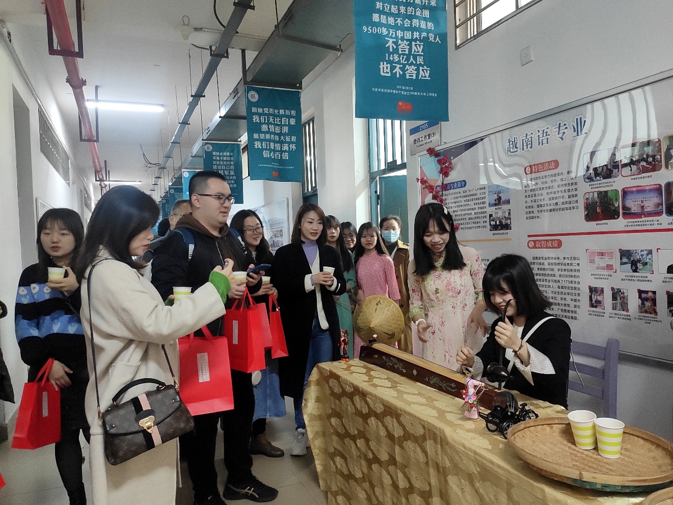 此次考察交流活动主要分为两个环节。首先,考察代表团参观了学院文化长廊,学习了解了语言文学学院近年来在书法、刻纸、茶艺等传统文化和东盟小语种,跨境商务等方面的办学成果。另外一个环节是交流座谈会,由大外第二教研室主任覃浩老师主持。座谈中,何玲院长对柳州工学院代表团的到来表示热烈的欢迎,并就近年来取得的办学成果、改革思路、师资队伍建设等方面向嘉宾们进行了介绍。接下来,学院相关专业老师依次向考察团介绍了我院近年来在区级一流课程建设、信息化教学改革、大学英语无纸化考试及在线课程建设、英语专业评估准备工作、应用型人才培养等教学改革及管理方面的情况。最后自由讨论环节中,双方院校老师也对各自相关专业及课程教学管理方面的工作进行了更深入的交流。