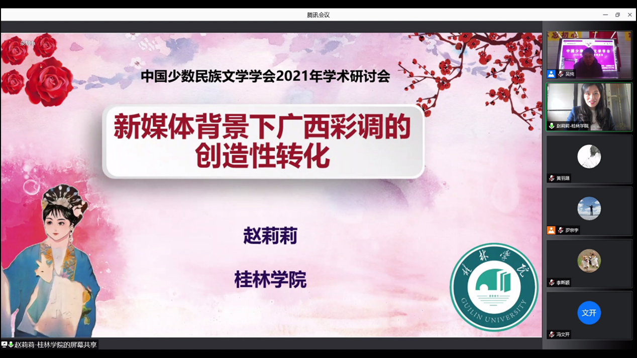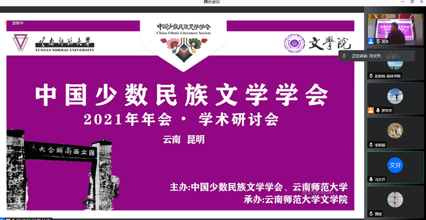 11月27日,中国少数民族文学学会2021年学术研讨会在云南昆明举行。由于受到疫情影响,本次研讨会采取线上线下相结合的方式举行。来自全国各地各民族的200多名学者参加本次会议,提交论文近200篇,主要围绕民族文学、民族音乐、少数民族文化的保护和传承、以及国内外学者对我国少数民族的研究等方面进行研讨。我校教师赵莉莉宣读论文《新媒体背景下广西彩调的创造性转化》,向与会的专家学者介绍了我校教师在广西彩调创造性转化方面的思考和探索,以及亟待解决的问题。同时,也向中国少数民族文学研究学者们学习了研究思路和方法。