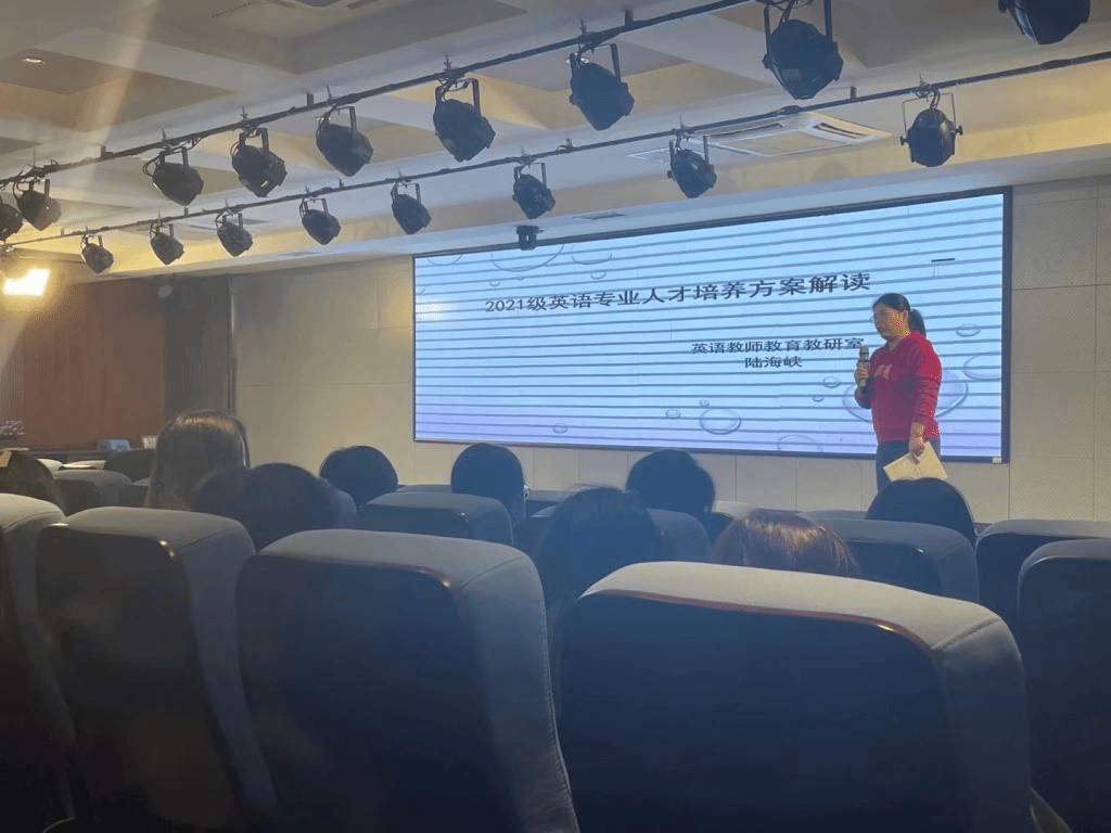 11月29日晚,语言文学学院在至善讲堂召开英语专业2021级人才培养方案解读座谈会。英语教师教育教研室主任陆海峡老师对2021级英语专业的人才培养方案进行了细致全面地解读。