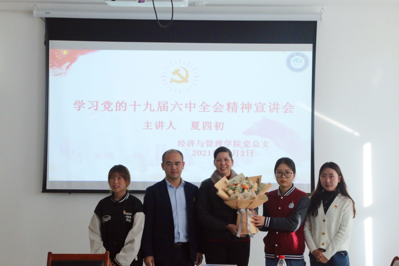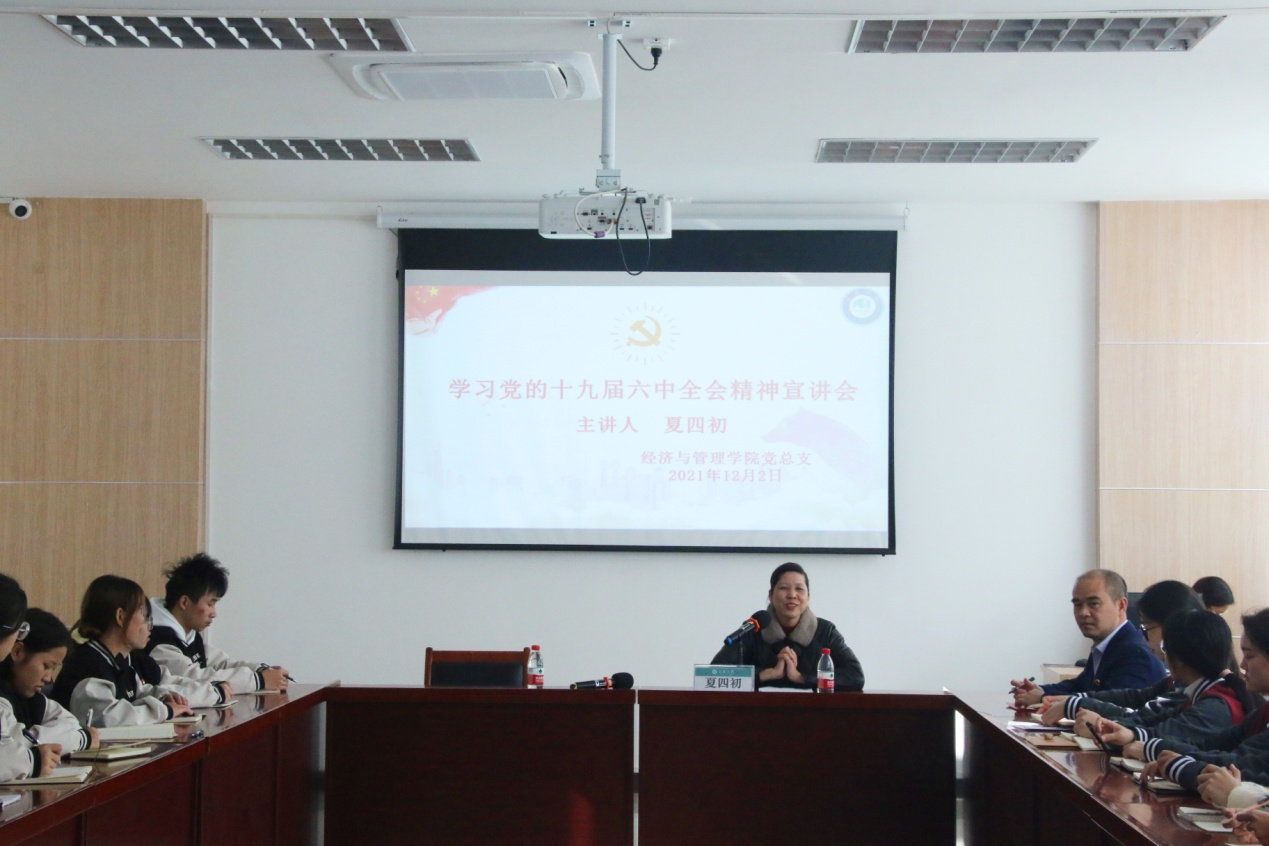 12月2日下午,经济与管理学院党总支在图书馆三楼会议室开展学习贯彻党的十九届六中全会精神宣讲报告会。党的十九大代表、桂林市公共交通集团有限公司平山站场党支部书记兼副经理夏四初应邀作报告。